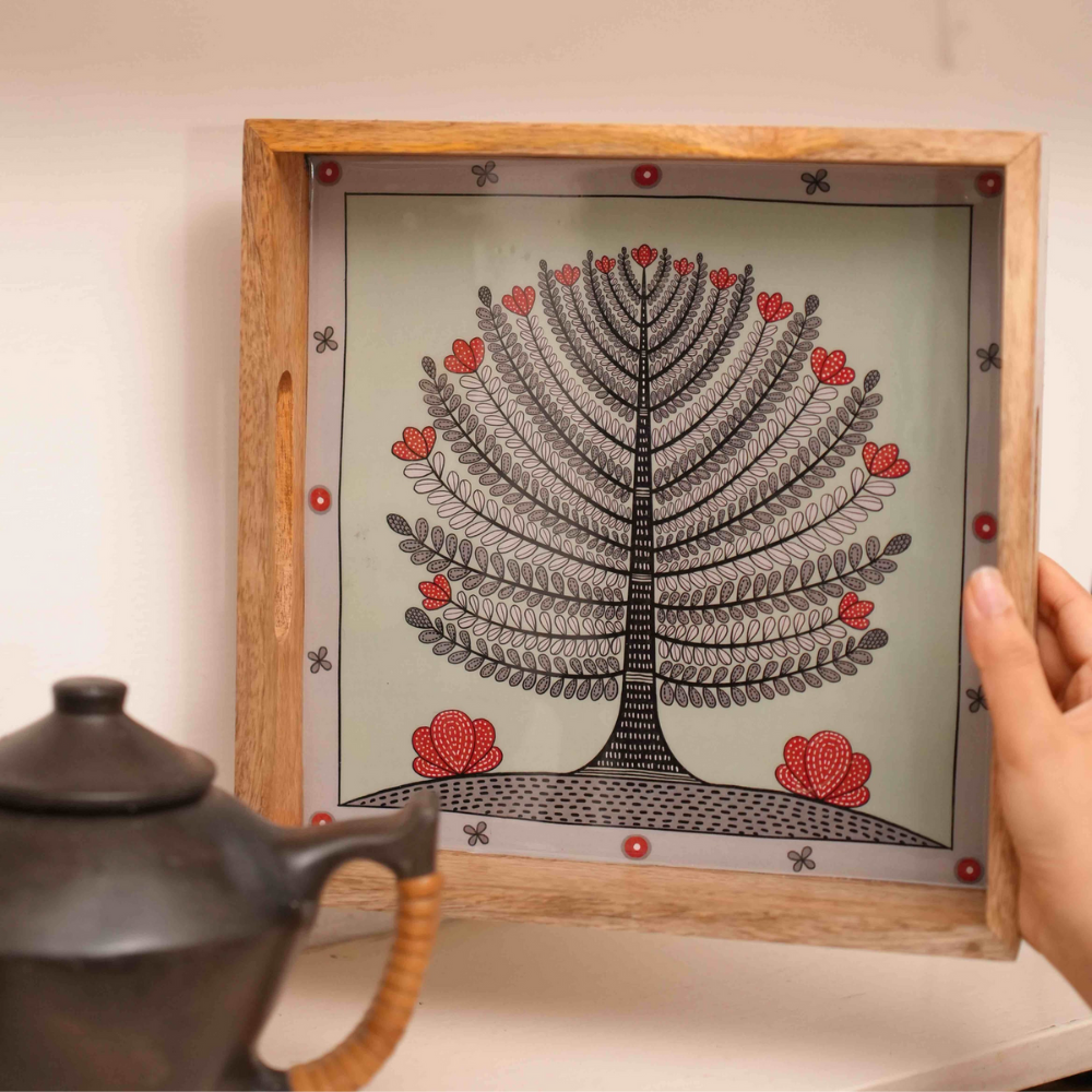 Add a touch of tradition to your everyday rituals with our Wooden Tray. Perfect for serving beverages, water , snacks and sweets : This  tray is not just functional but a piece of art in itself. The intricate motifs tell stories of our Artisans making your hosting experience both aesthetic and meaningful.