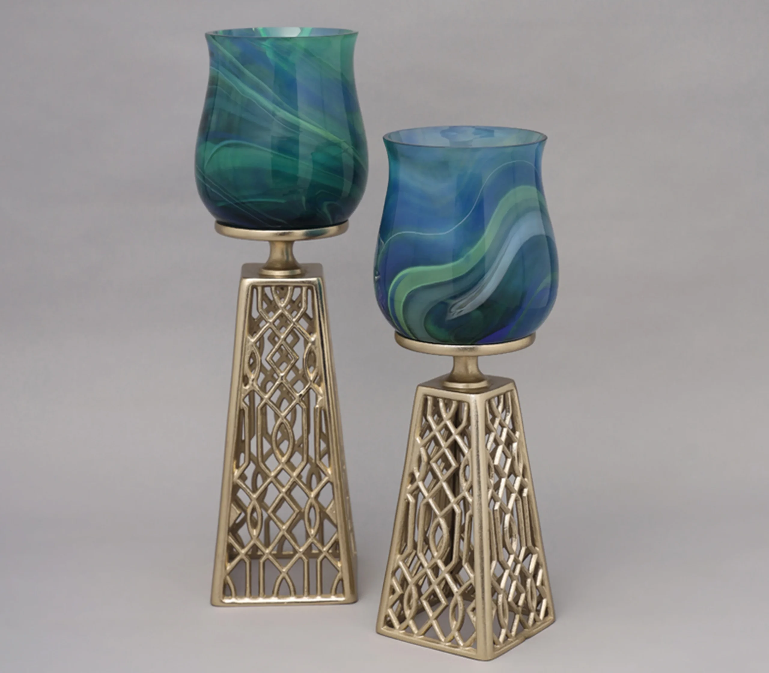 The arabian sea pillar candle holder is a mesmerizing and graceful addition to your table decor or even an eye catching addition as an accent decor piece in any area of your home. Intricately designed and crafted with a beaming gold finish on virgin aluminum and peacock onyx glass, this piece brings opulence straight into your home.