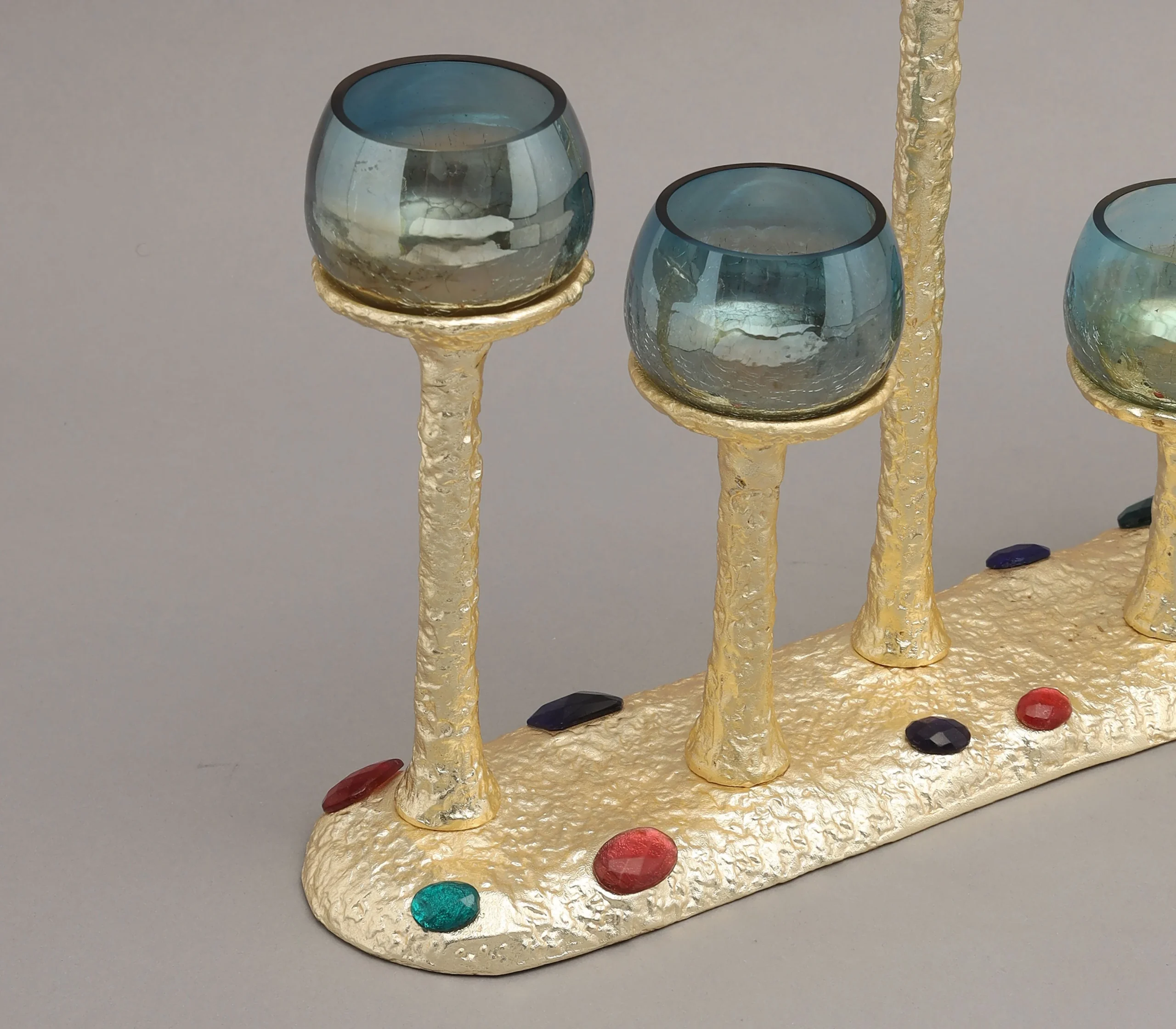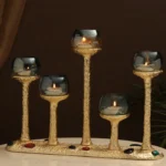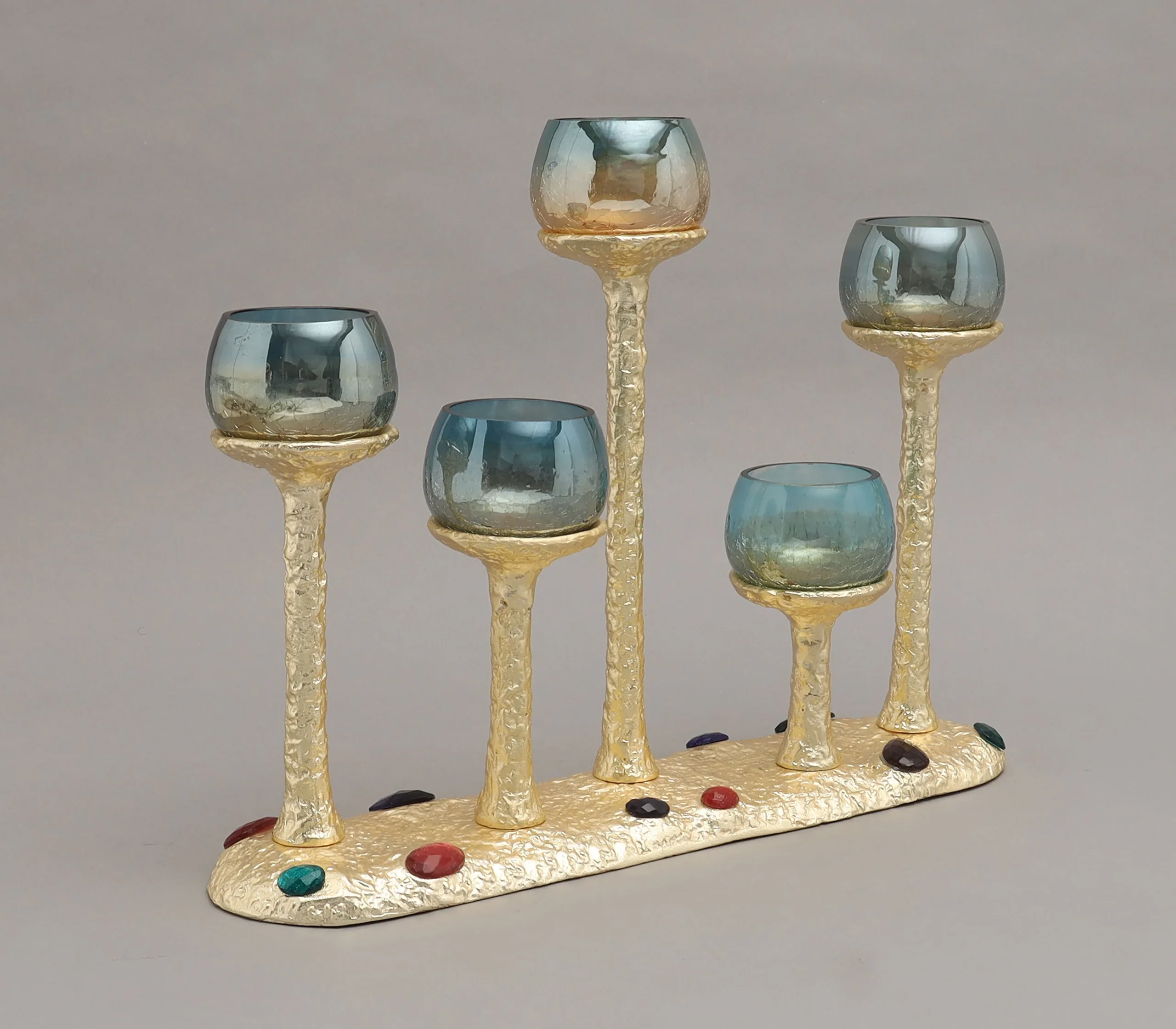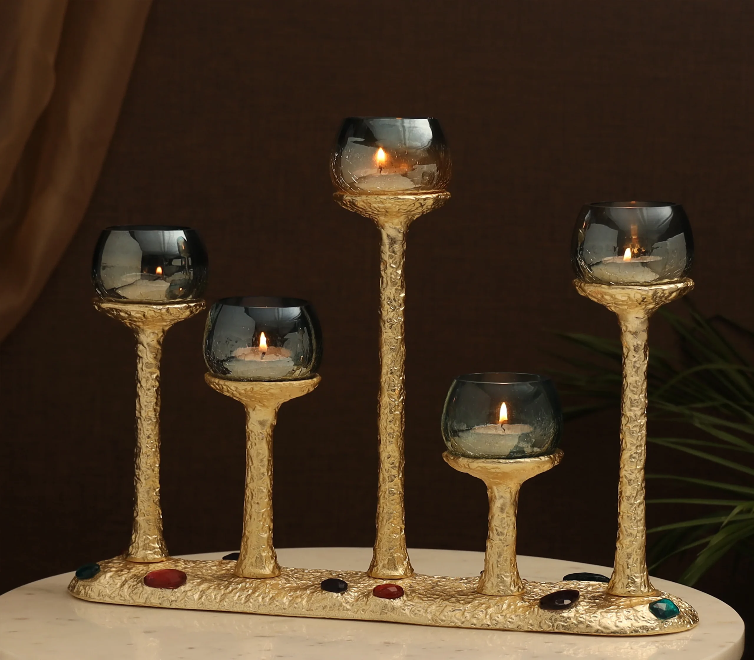 The multi light candle holder is a stunning way of brightening up any space. With 5 different holders crafted expertly of half crackled glass holders, beads and a beaming gold finish on virgin aluminum, this holder makes for a spectacular display.