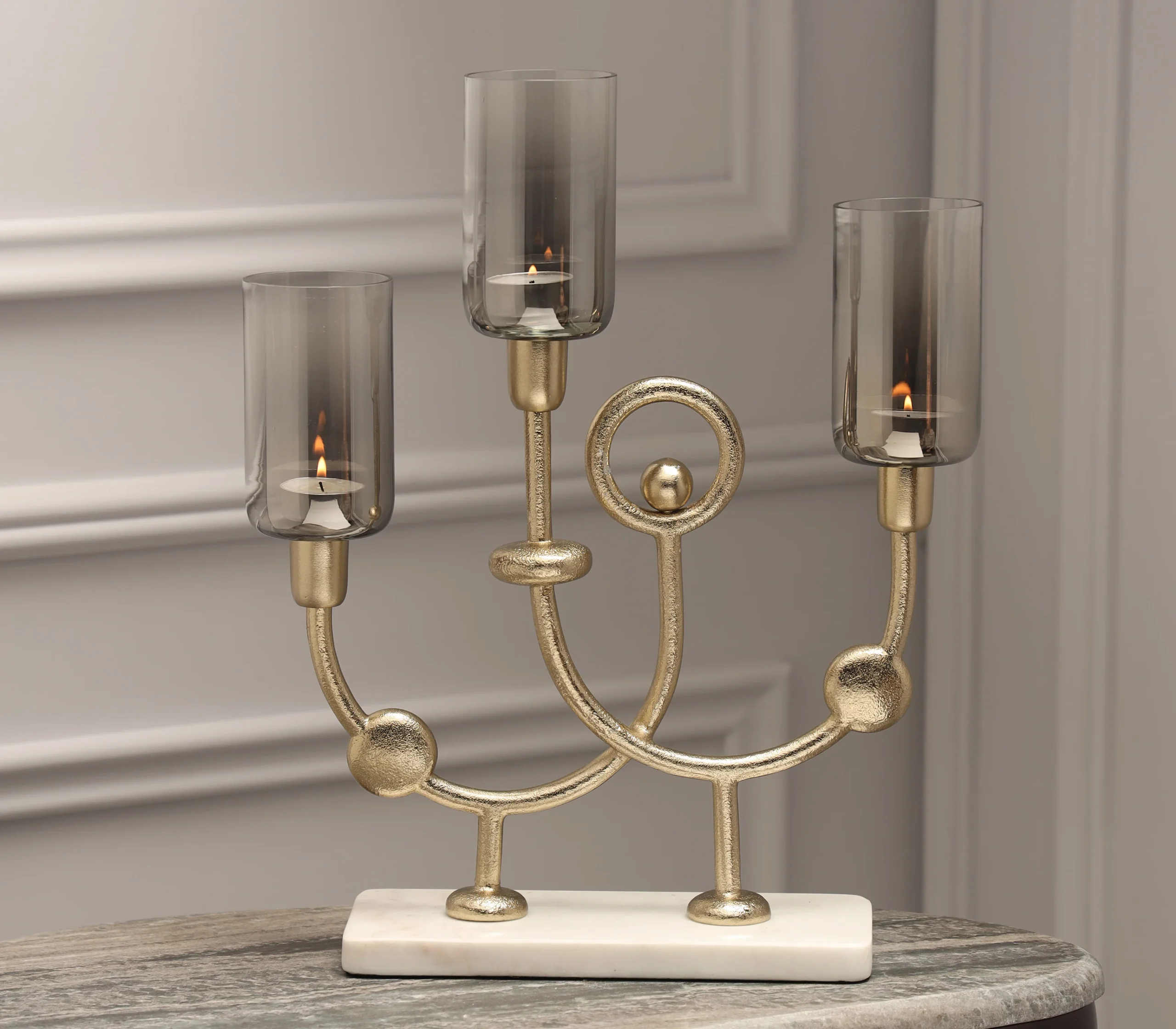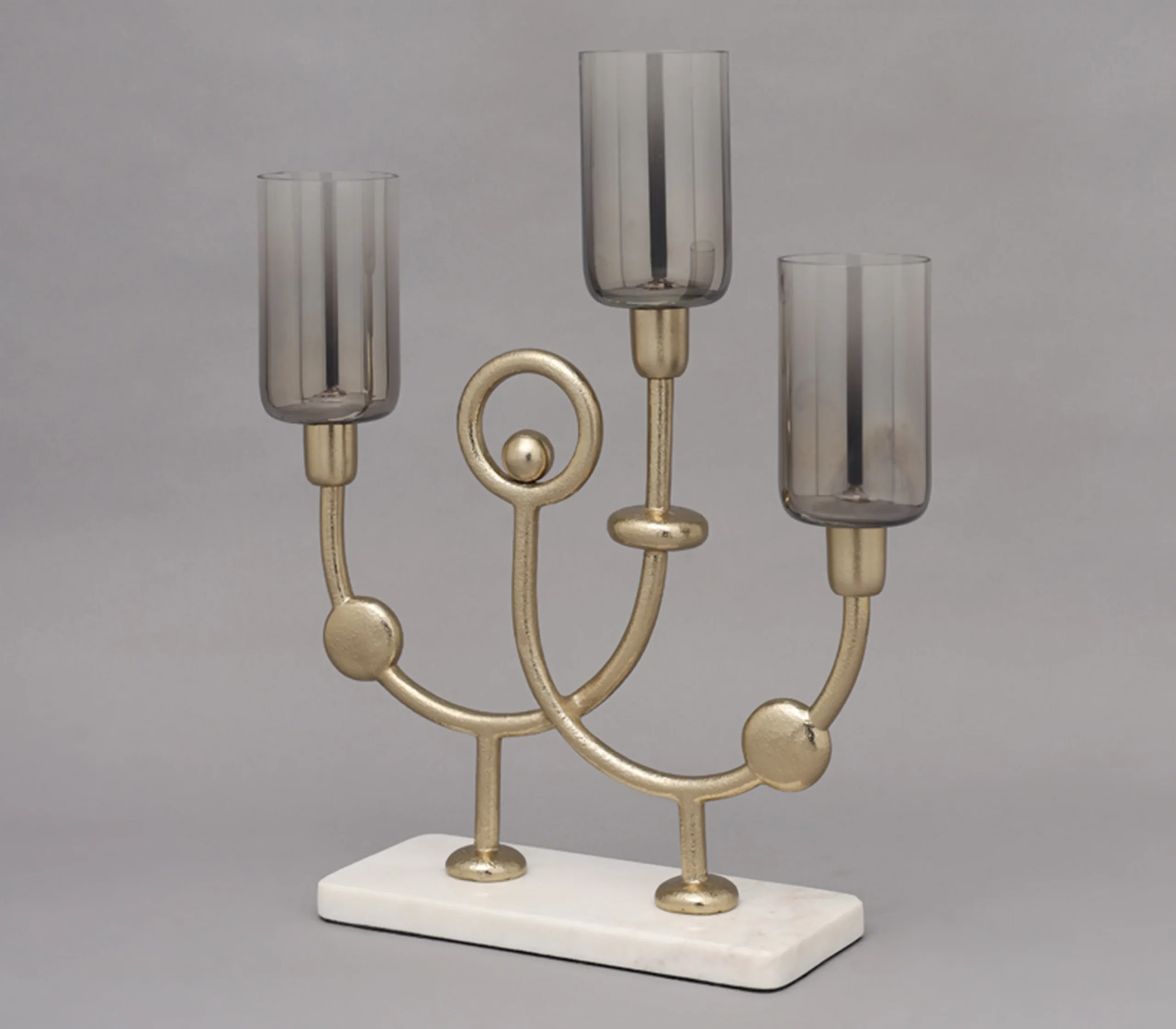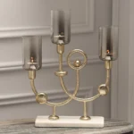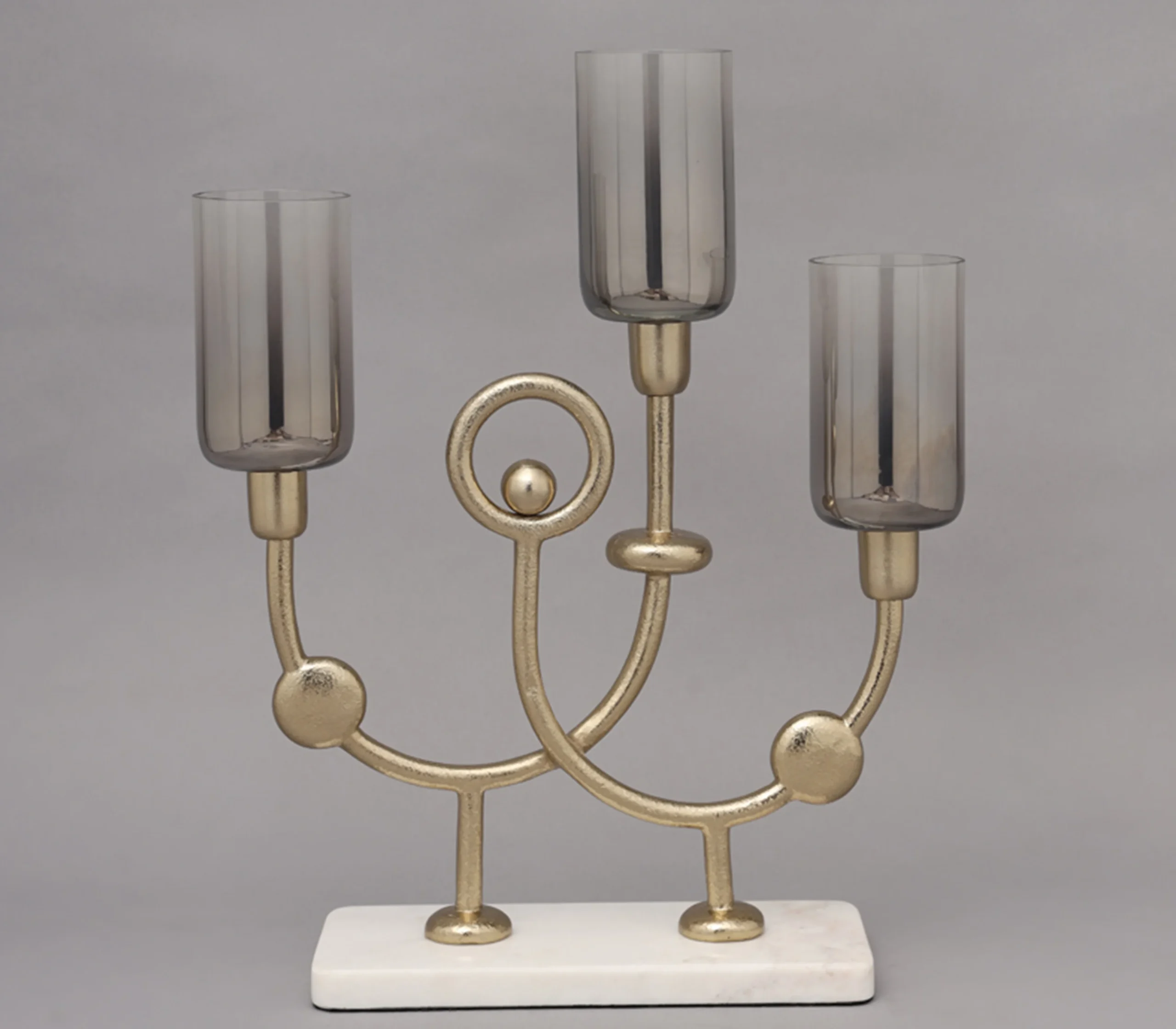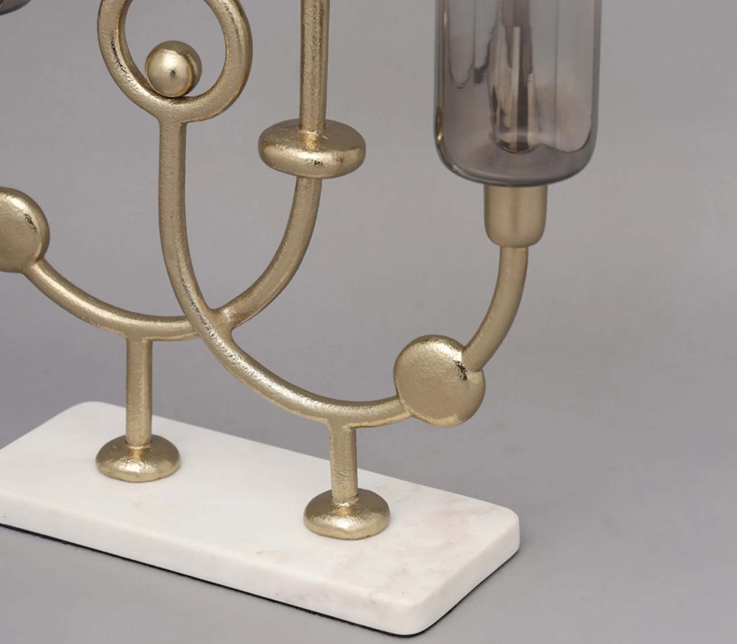 Summon the energies of the cosmos into your home with the celestial multi votive holder. The celestial design of the gold finished virgin aluminum are holding up half black chrome glass  votives with white marble base. This gorgeous stand radiates a divine golden aura onto any candlelit occasion.