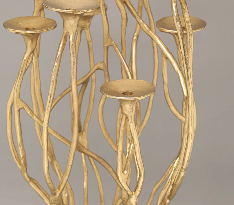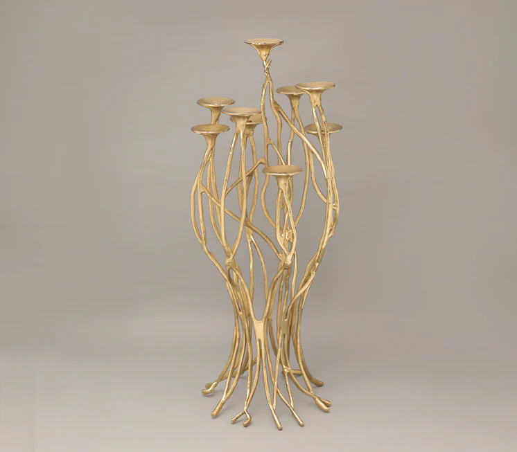 The gold finish enhances the organic design, blending the rustic charm of nature with the sophistication of modern metallics. Perfect as a statement piece in your entryway, the eternity candle holder is versatile enough to complement both contemporary and traditional interiors.