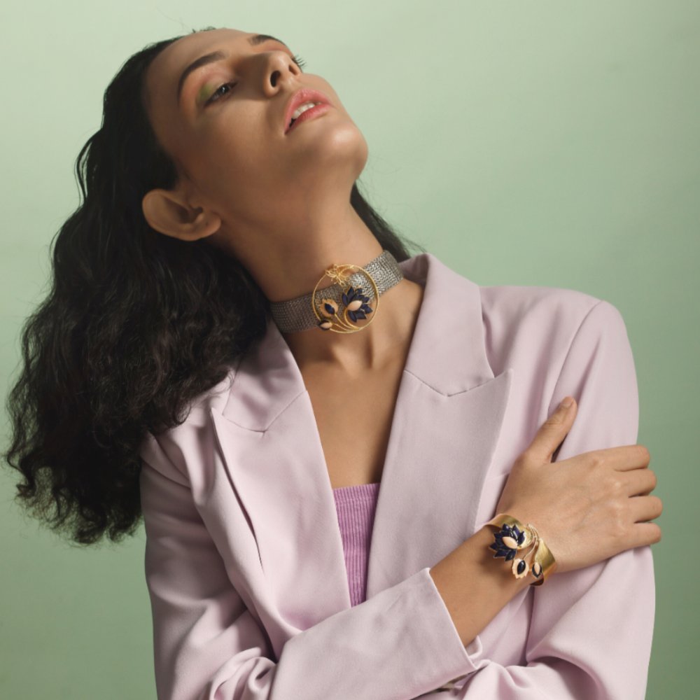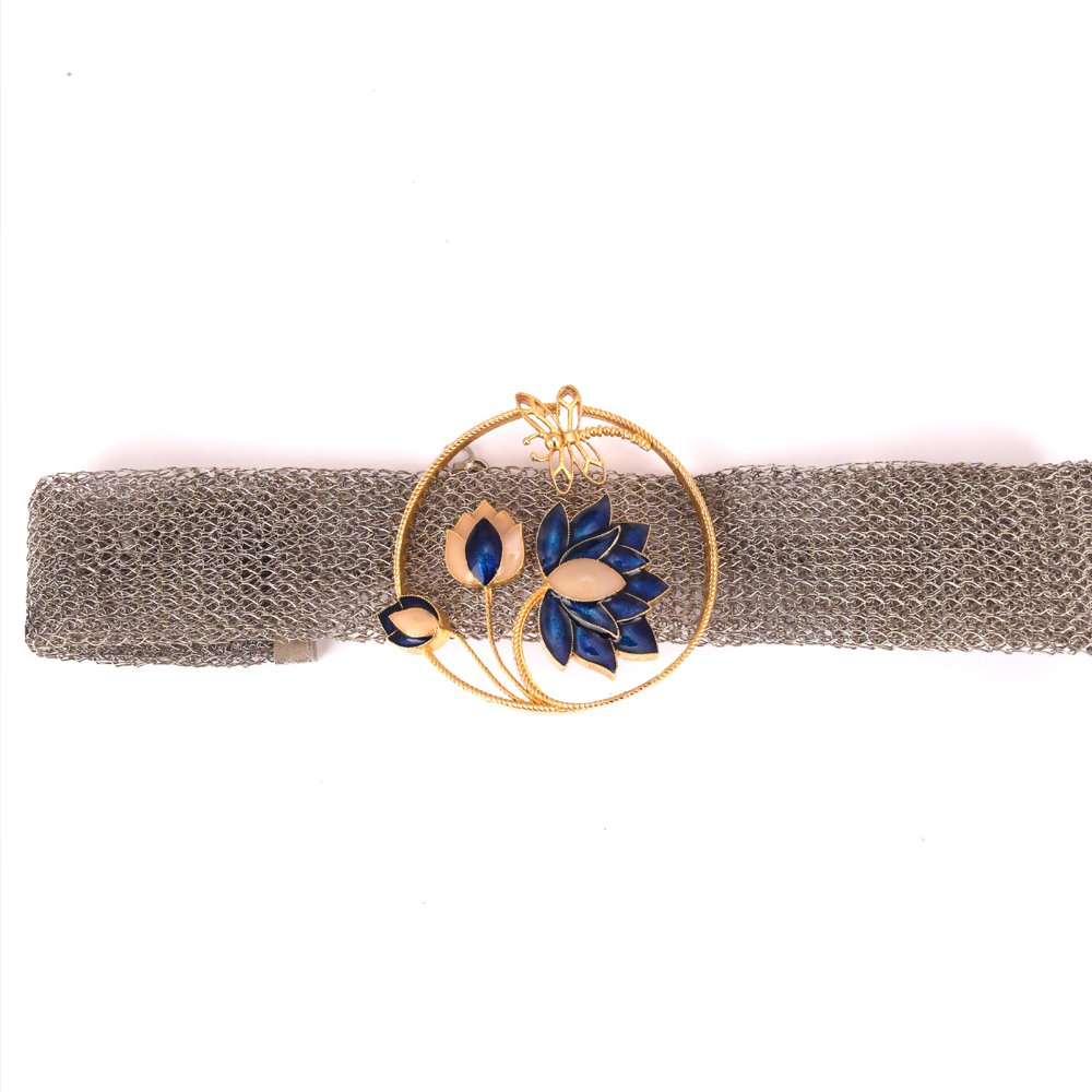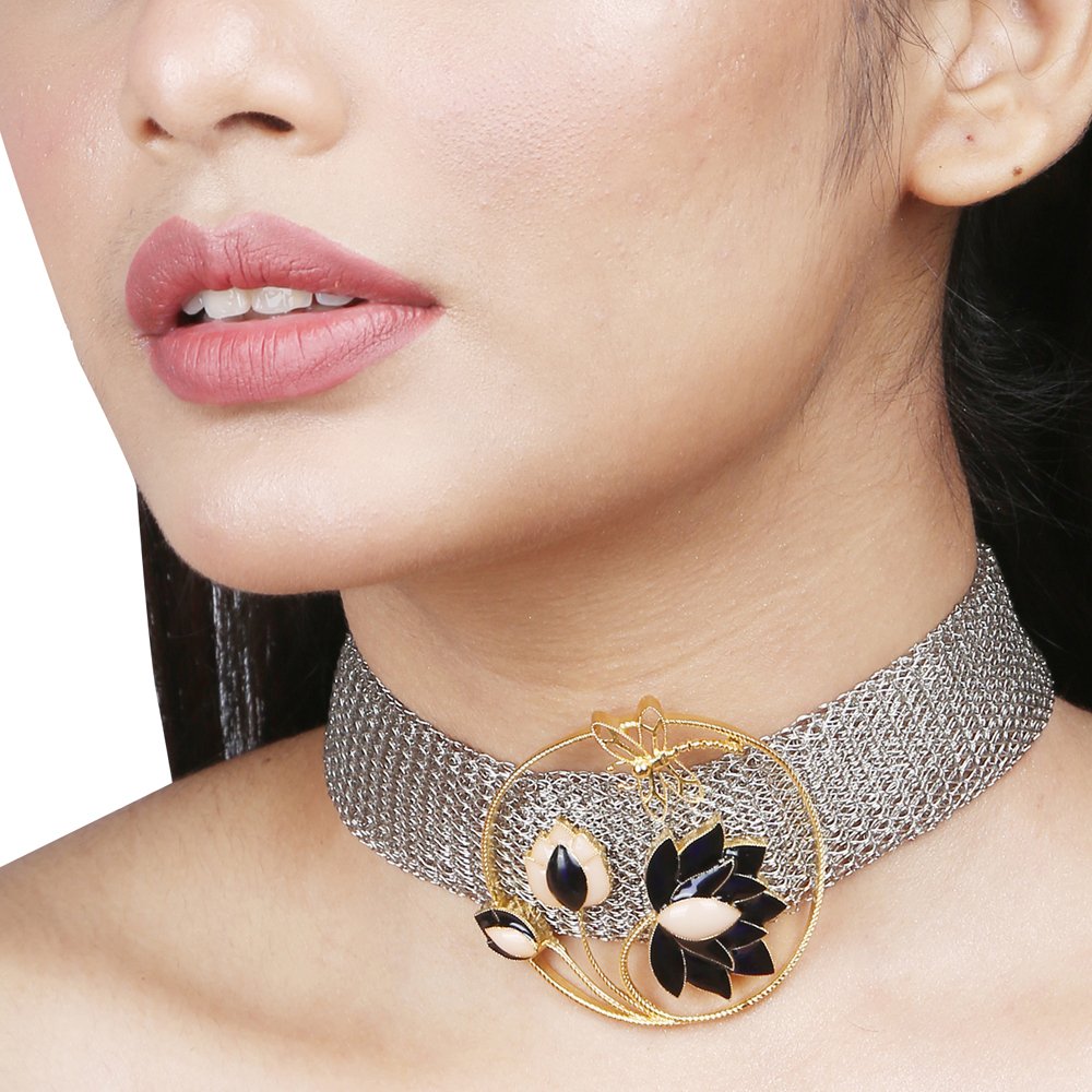Hand crafted enamel hues of blue with subtle traces of designed keeping the fierce yet elegant woman in mind. The mesh adds a worldly charm to this already bold piece of jewellery. This collection is an ode to the extravagant beauty of the lotus. Set in brass metal with silver and hand crafted enamel plating.