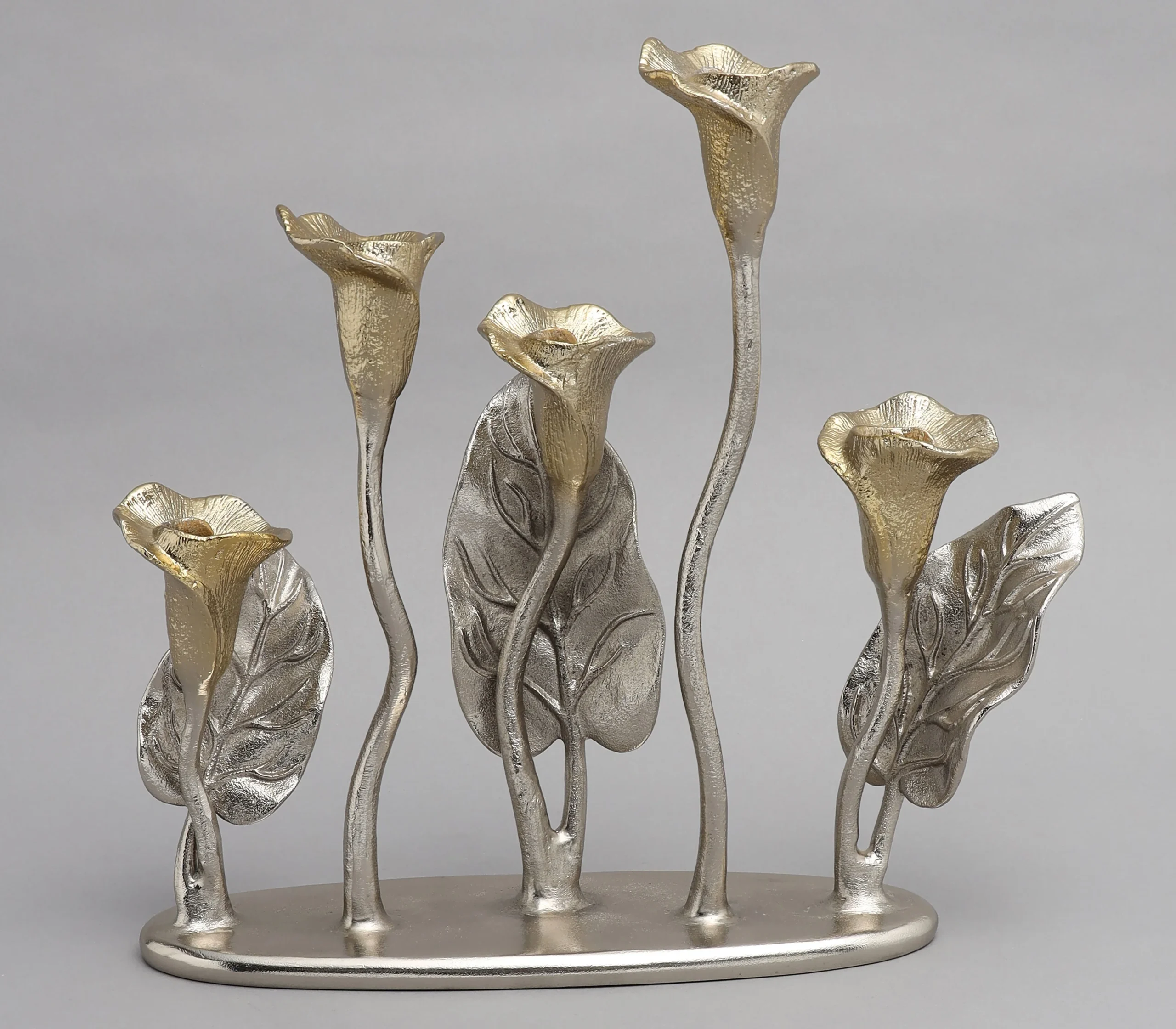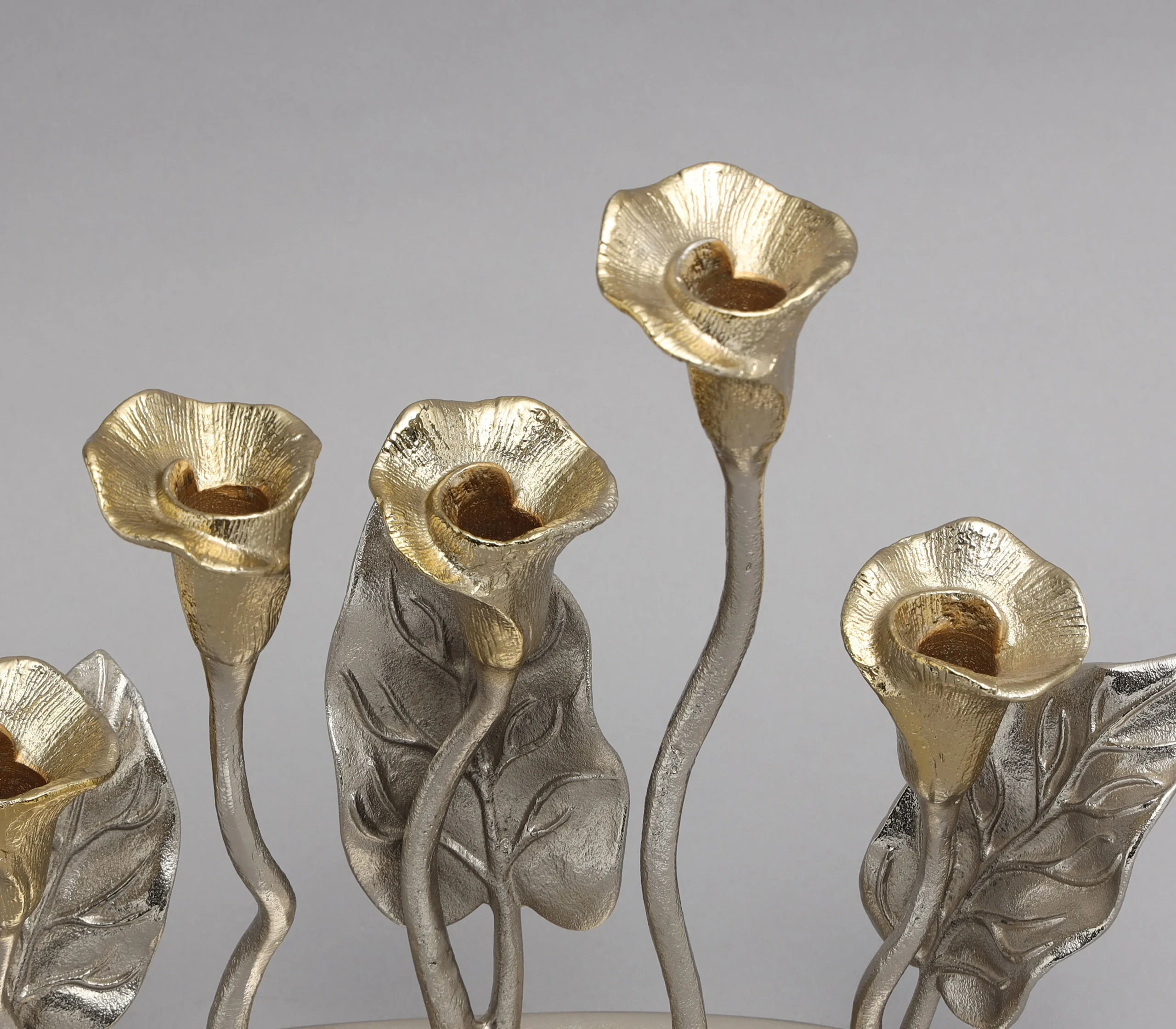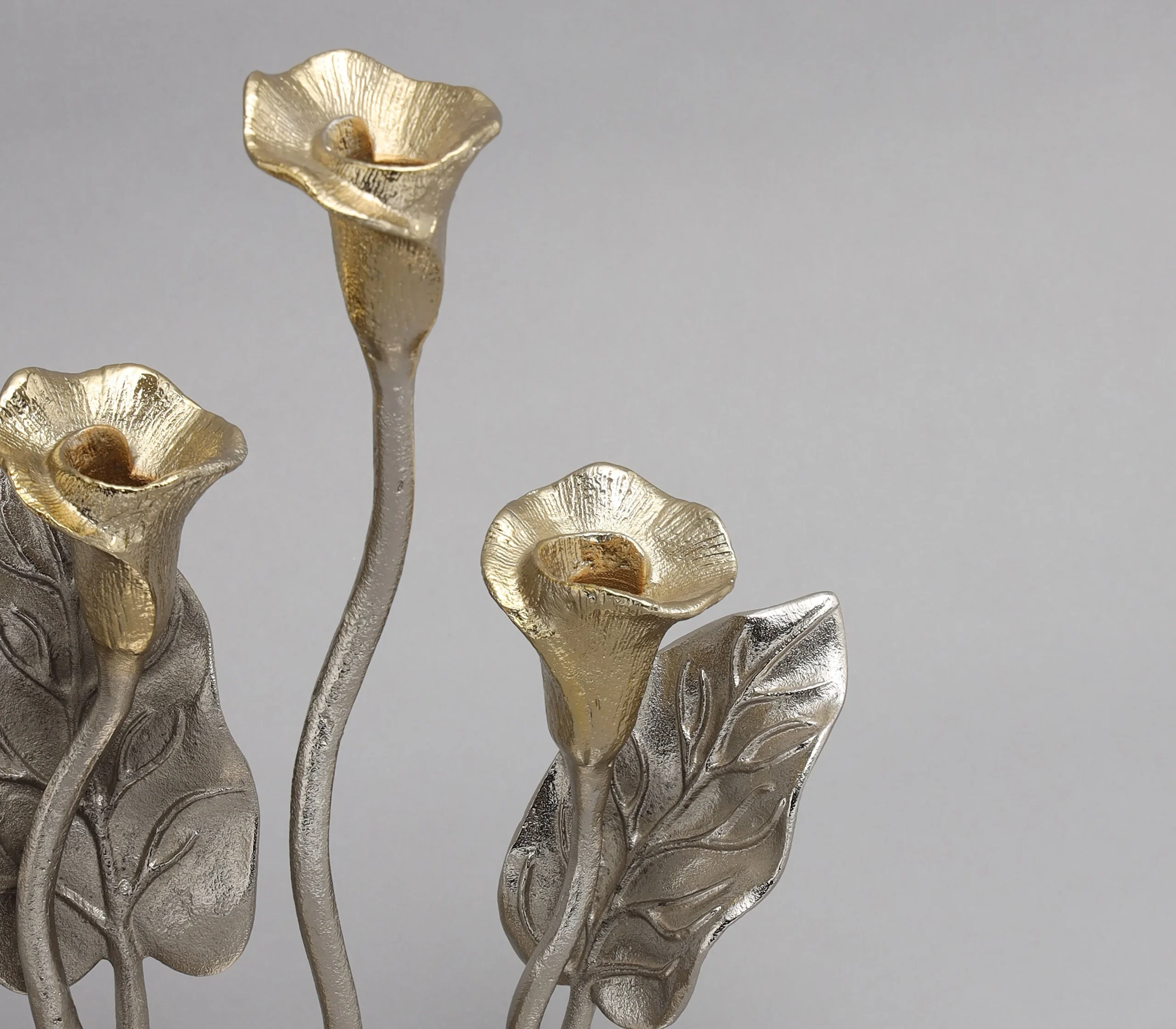 An alluring piece of decoration by day and captivating by night when a candle is lit inside it. This felicity taper candle holder is inspired by the beautiful Lily blossoms in nature. The silver plated and gold finished virgin aluminium flower sculpture gives your house an effervescent energy and livens up any room..