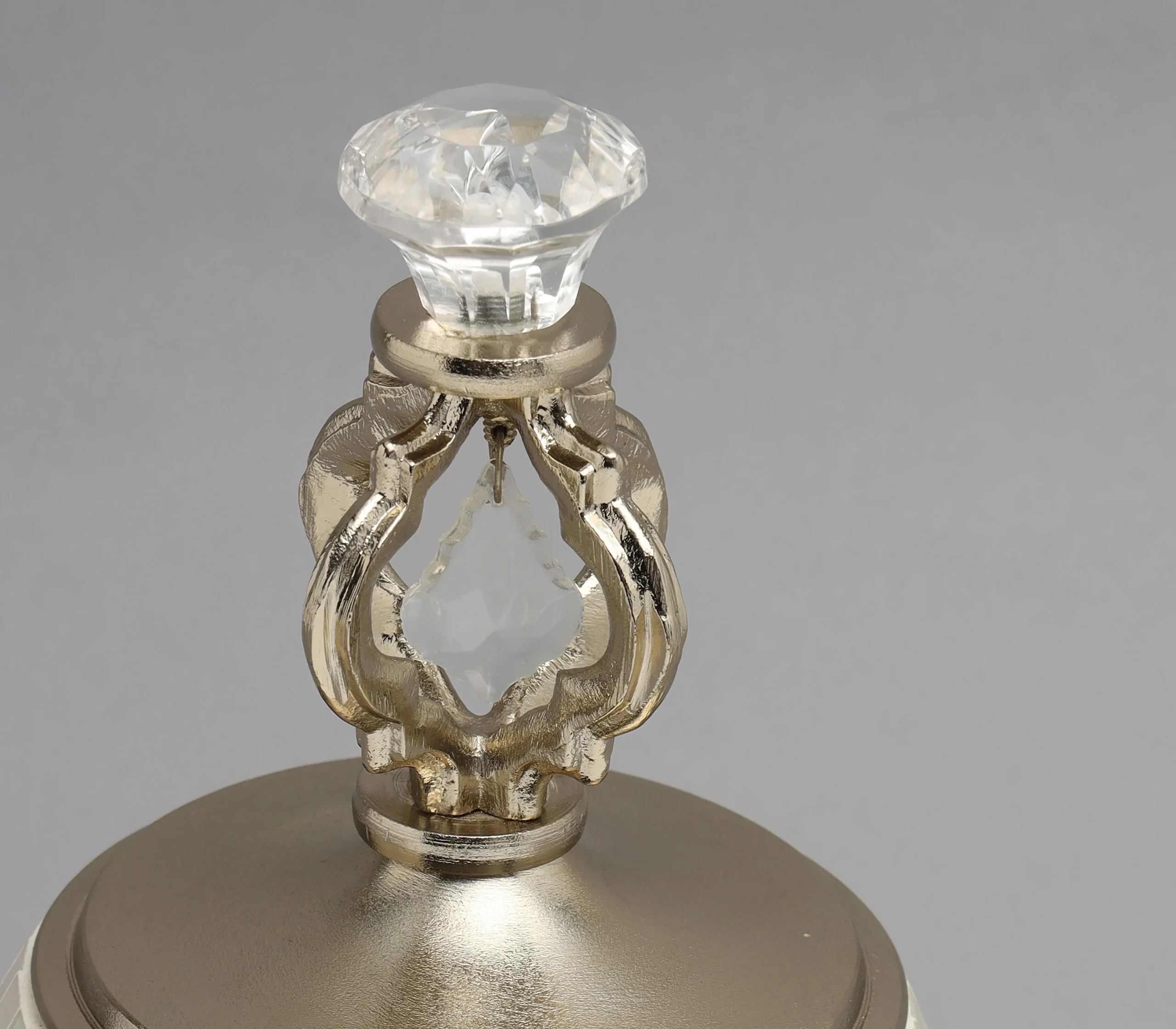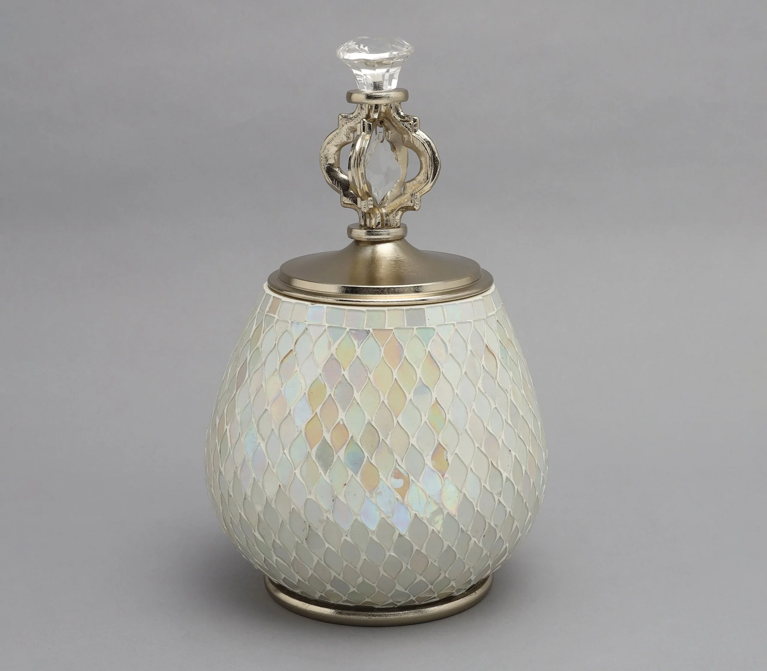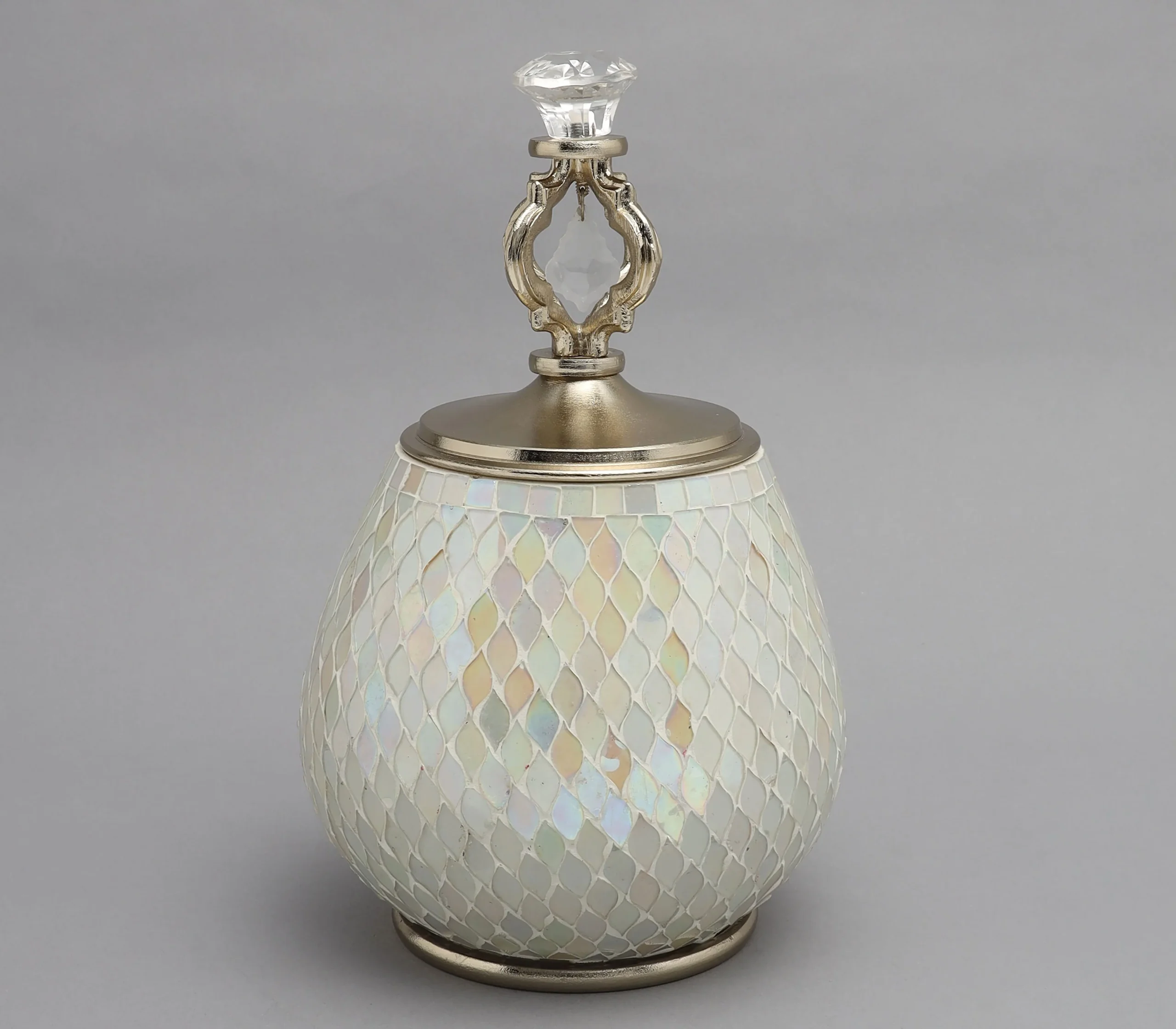 This stunning jar is expertly crafted of gold finished virgin aluminium with glass mosaic chips and crystal. A true testament to skillful artistry. Place the jar with different sizes n shapes of candles and decor accessories for a exaggerated and illuminous display.