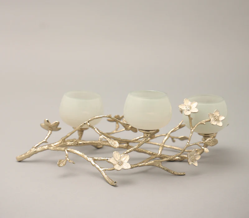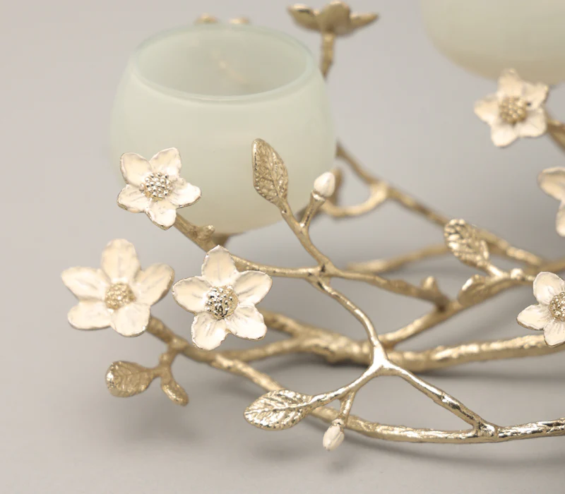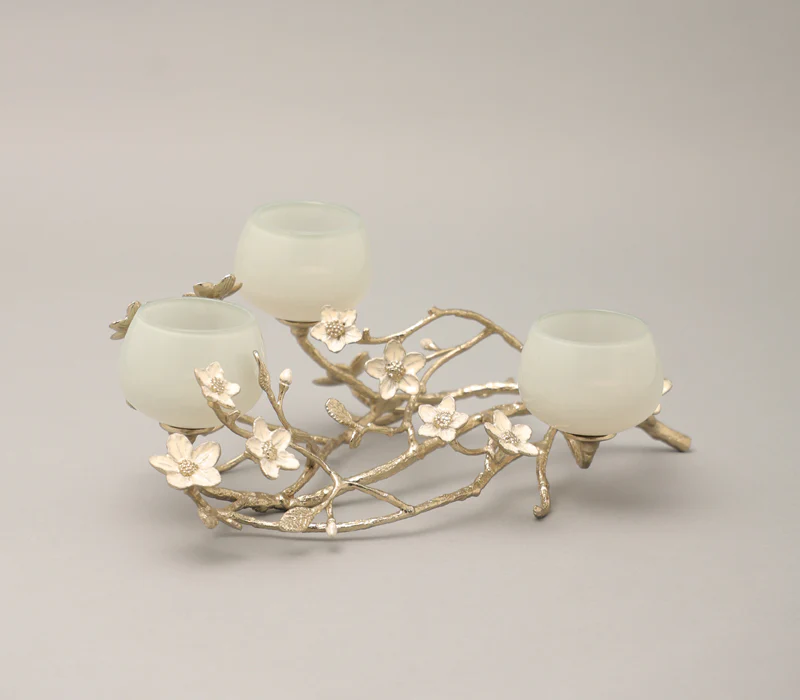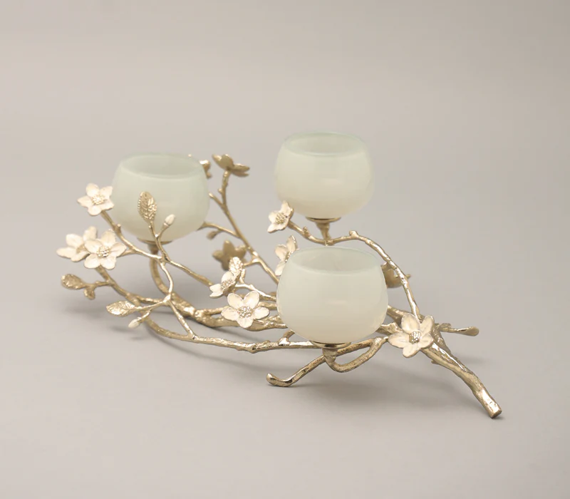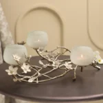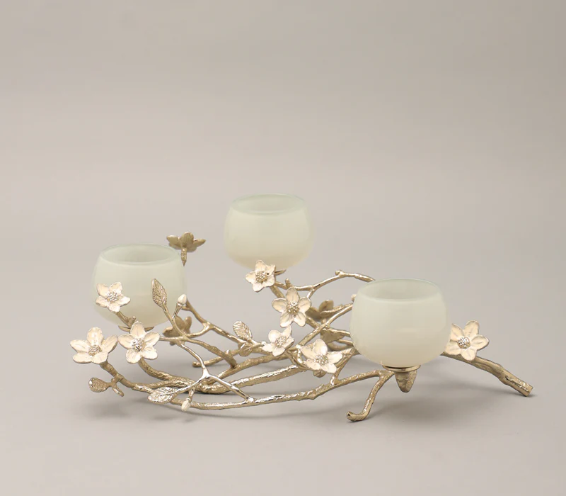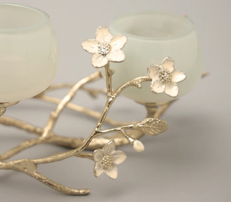 The jasmine whisper t-light holder is a captivating blend of elegance and natural beauty, perfect for adding a touch of charm to your decor. Crafted from gold-finished virgin aluminum and peach enamelled brass, this exquisite holder features a delicate network of small branches adorned with white jasmine flowers, evoking the tranquility of a serene garden. Three mint-coloured glass t-light holders perch gracefully on the branches, casting a soft, enchanting glow when illuminated. Ideal for creating a warm and inviting atmosphere, whether for special occasions or as a charming everyday accent, the jasmine whisper T-light holder transforms any space into a peaceful retreat, celebrating the beauty of nature in every detail.
