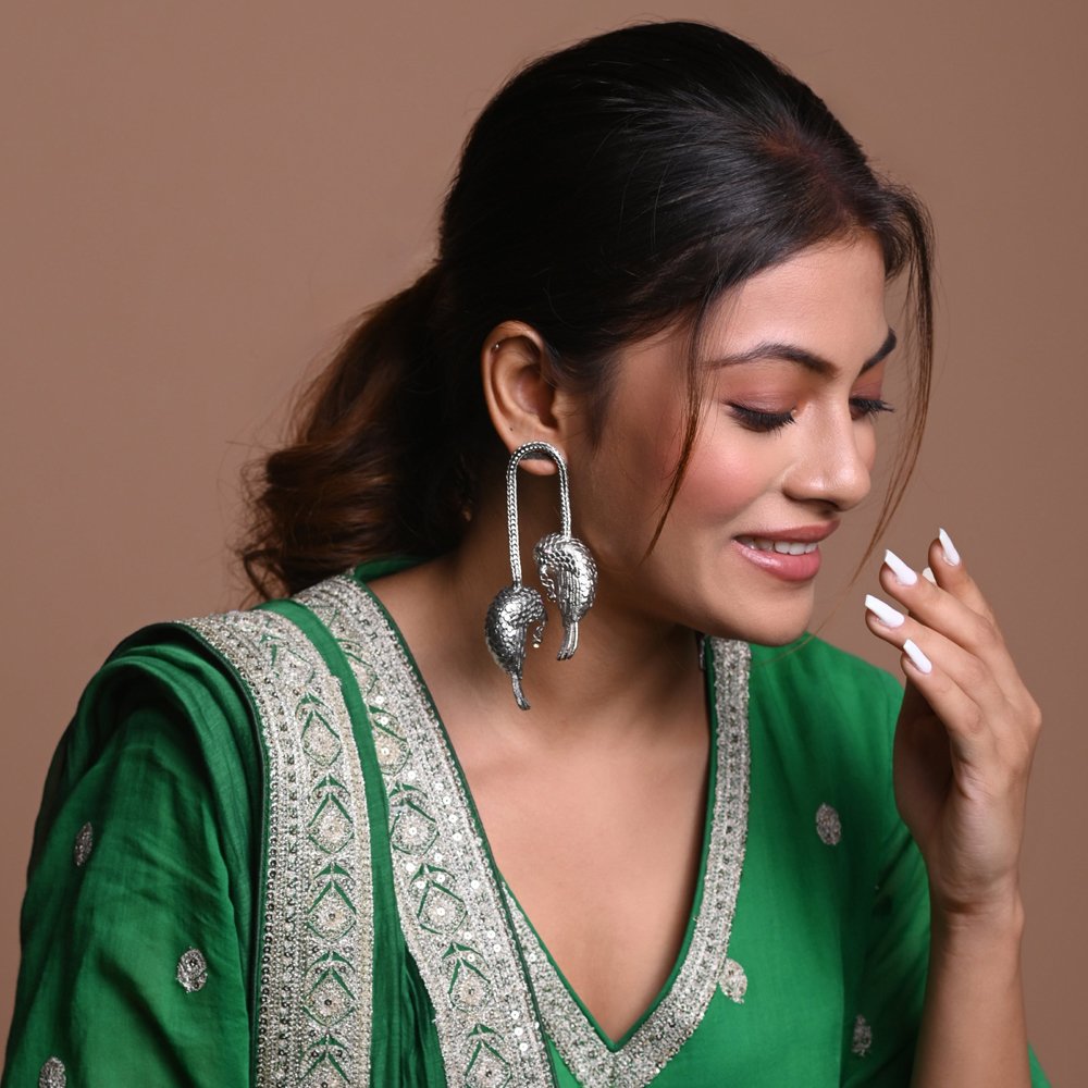 he neutral tones of these earrings add a subdued yet charming appeal to the wearer, enhancing any look in the day or at night! Set in brass metal with Rhodium plating.