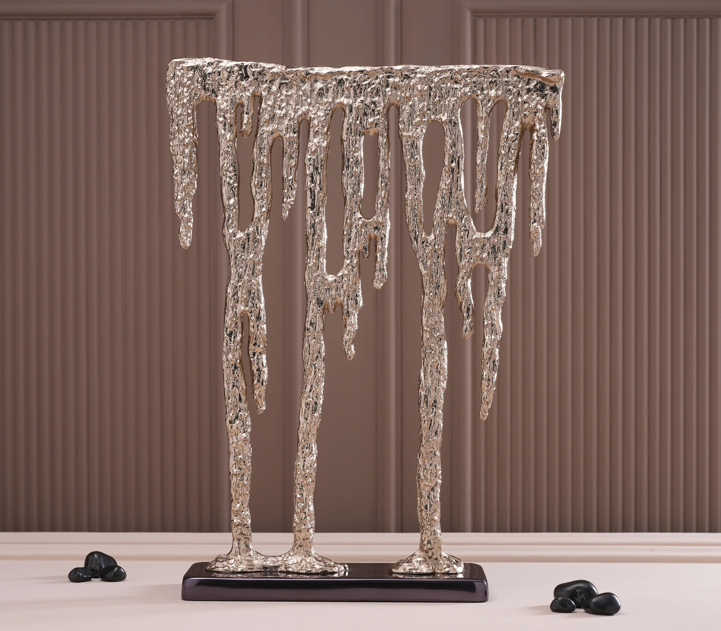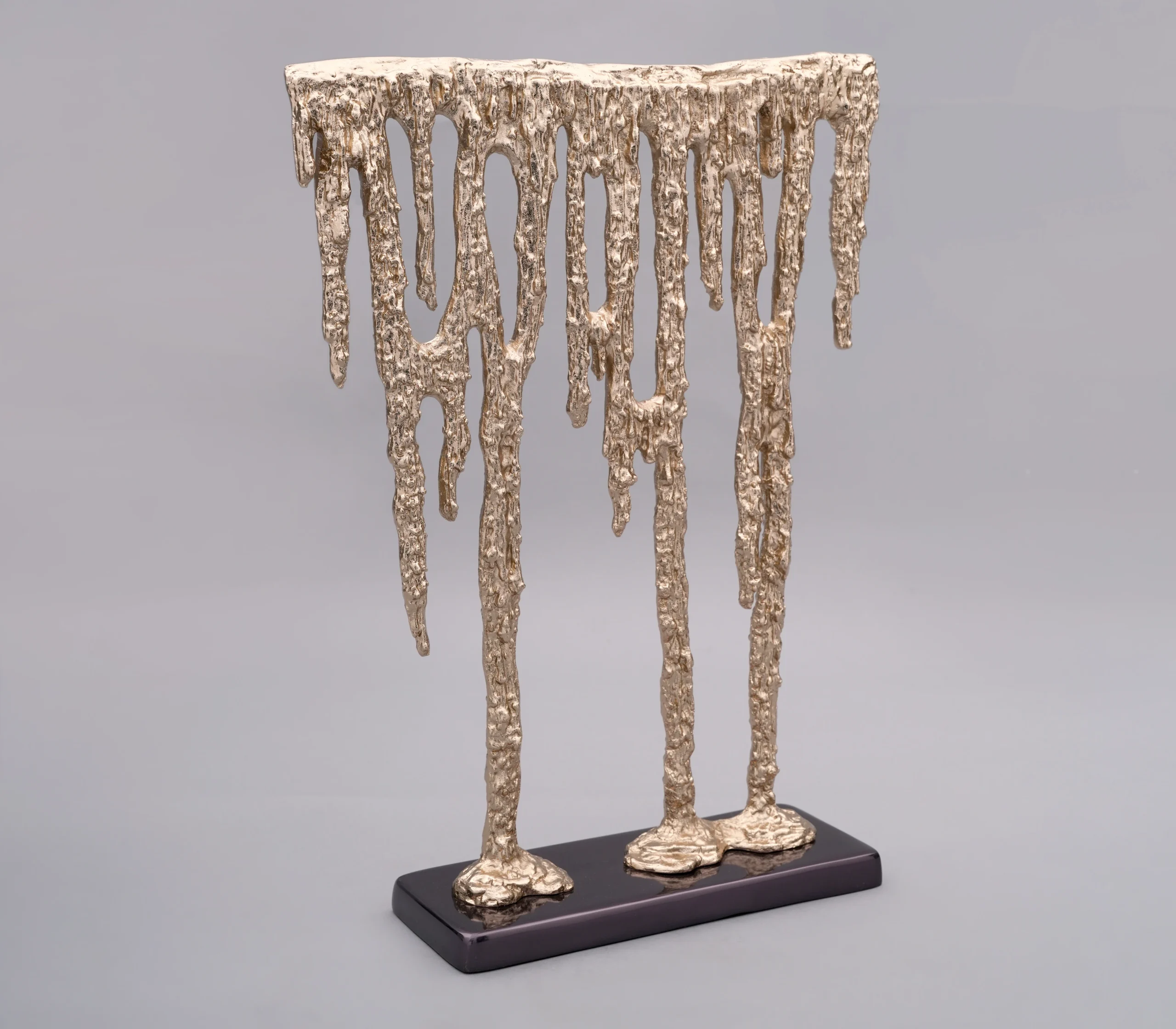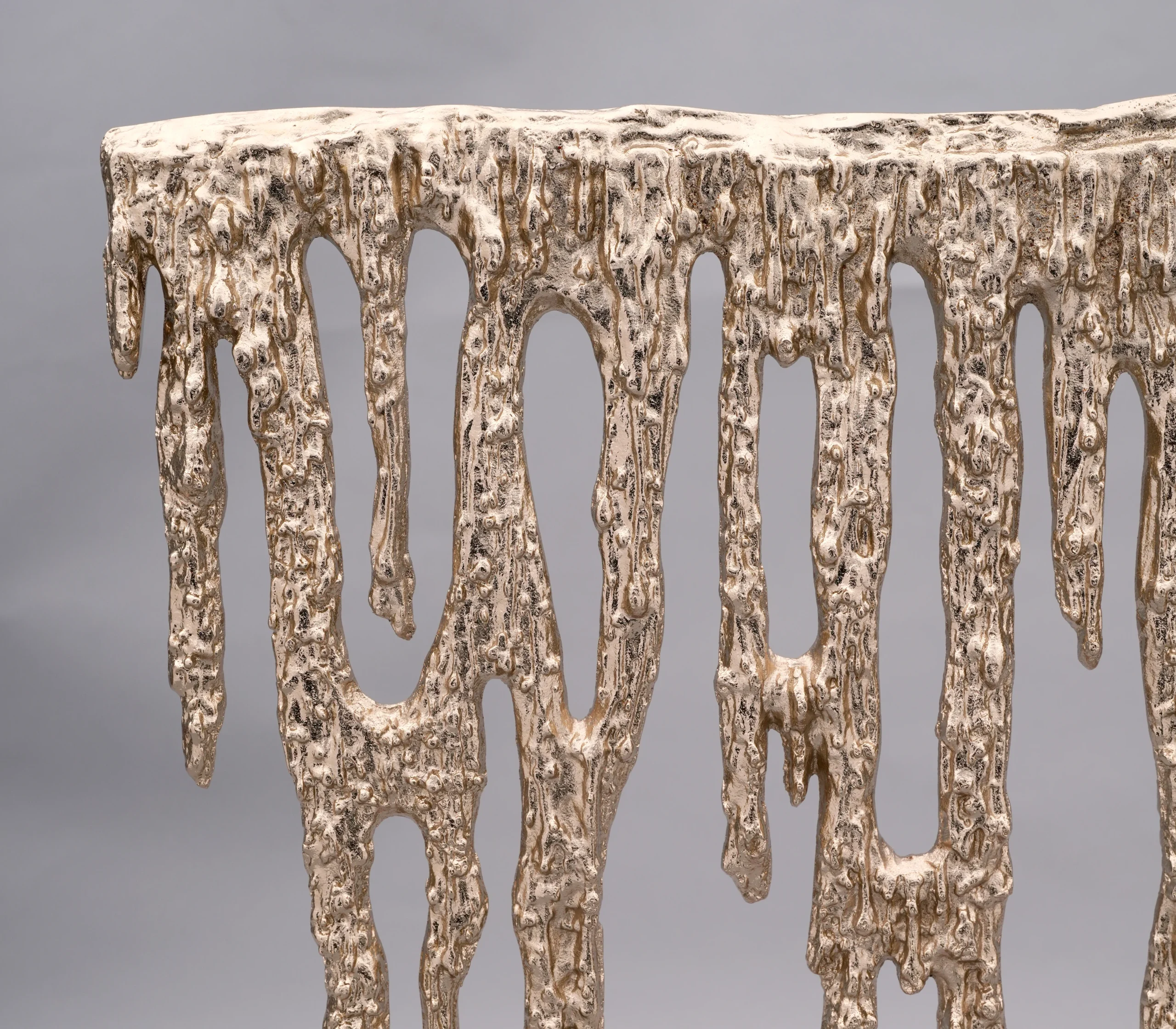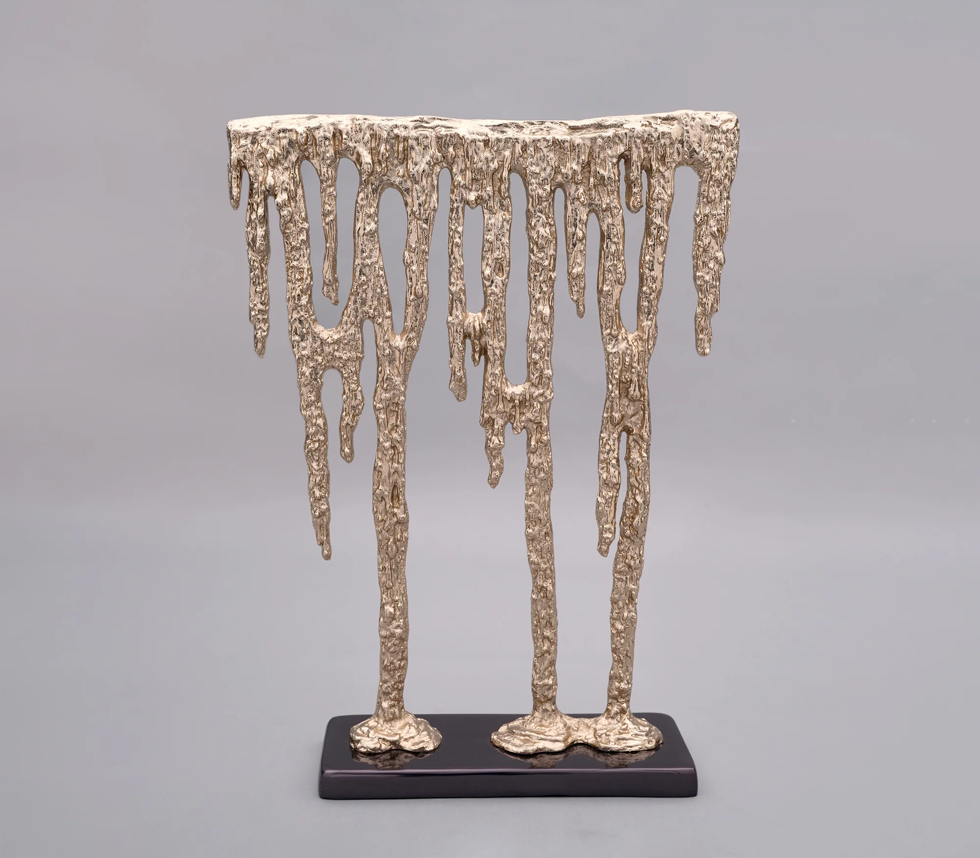 The opaline sculpture is a captivating blend of elegance and modern artistry, designed to evoke the serene beauty of molton metal. Crafted from gold-finished and black nickel-plated virgin aluminum, its fluid design captures the essence of delicate metal droplets in motion, creating a striking contrast between the rich gold tones and deep, reflective black.