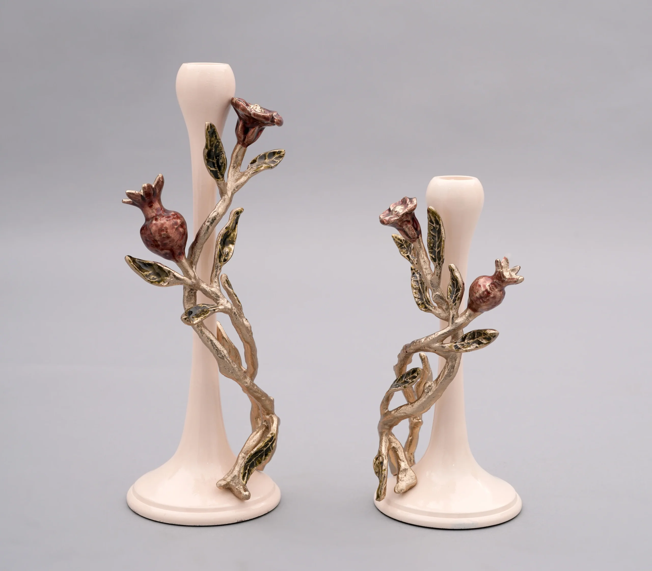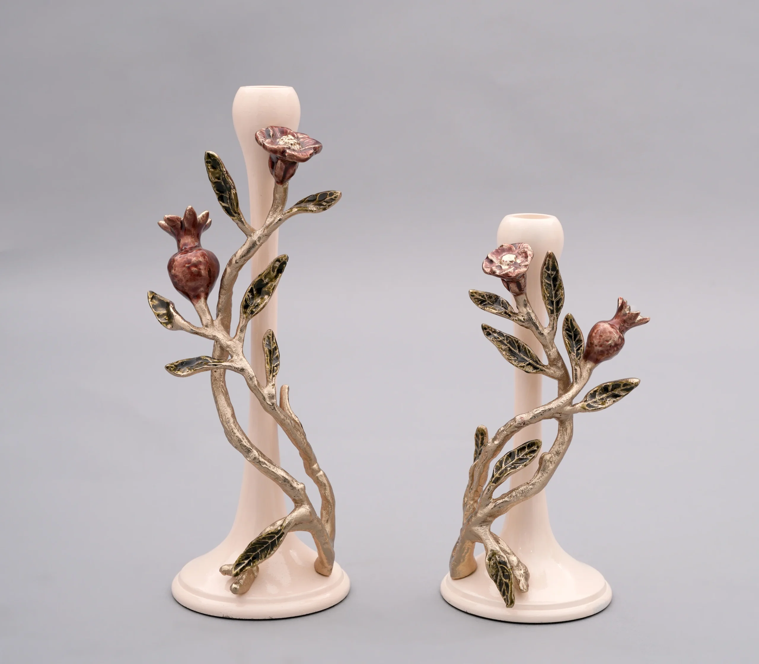 The pomo orb candle holder is a timeless blend of nature-inspired artistry and refined craftsmanship. Made from gold-finished beige powder-coated and enamelled virgin aluminum, it gracefully mimics a sprig of a tree adorned with delicate, miniature pomegranates. The rich gold finish and soft beige hues enhance its elegant, organic design, offering a sophisticated touch to any space.