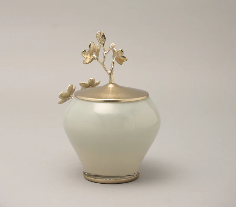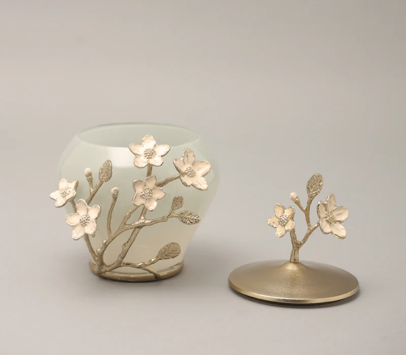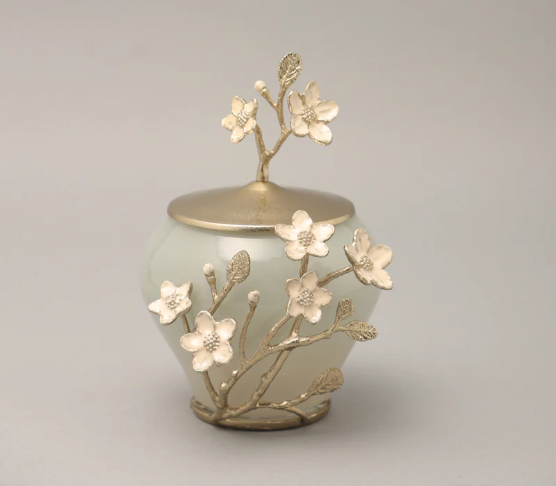 The regal jasmine jar is a stunning piece that beautifully blends luxury with nature-inspired elegance. Crafted from gold-finished virgin aluminum and brass with peach enamelled brass, this exquisite jar features a captivating peach to mint-coloured glass body, offering a fresh and vibrant contrast. Adorned with intricate branches of jasmine that gracefully wrap around the jar, it adds a touch of floral charm and sophistication. Perfect for storing treasured items or as a decorative statement piece, the regal jasmine jar effortlessly enhances any space, making it an ideal choice for those who appreciate refined artistry and the beauty of nature.