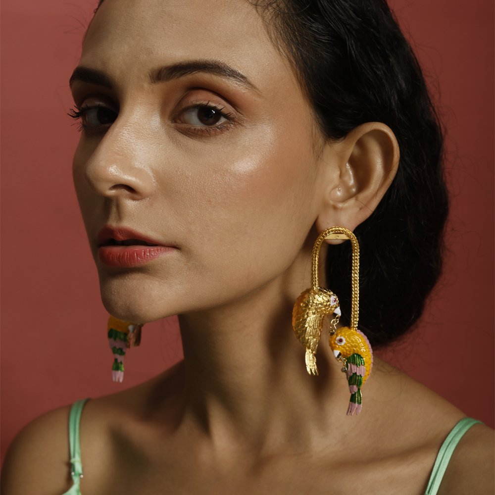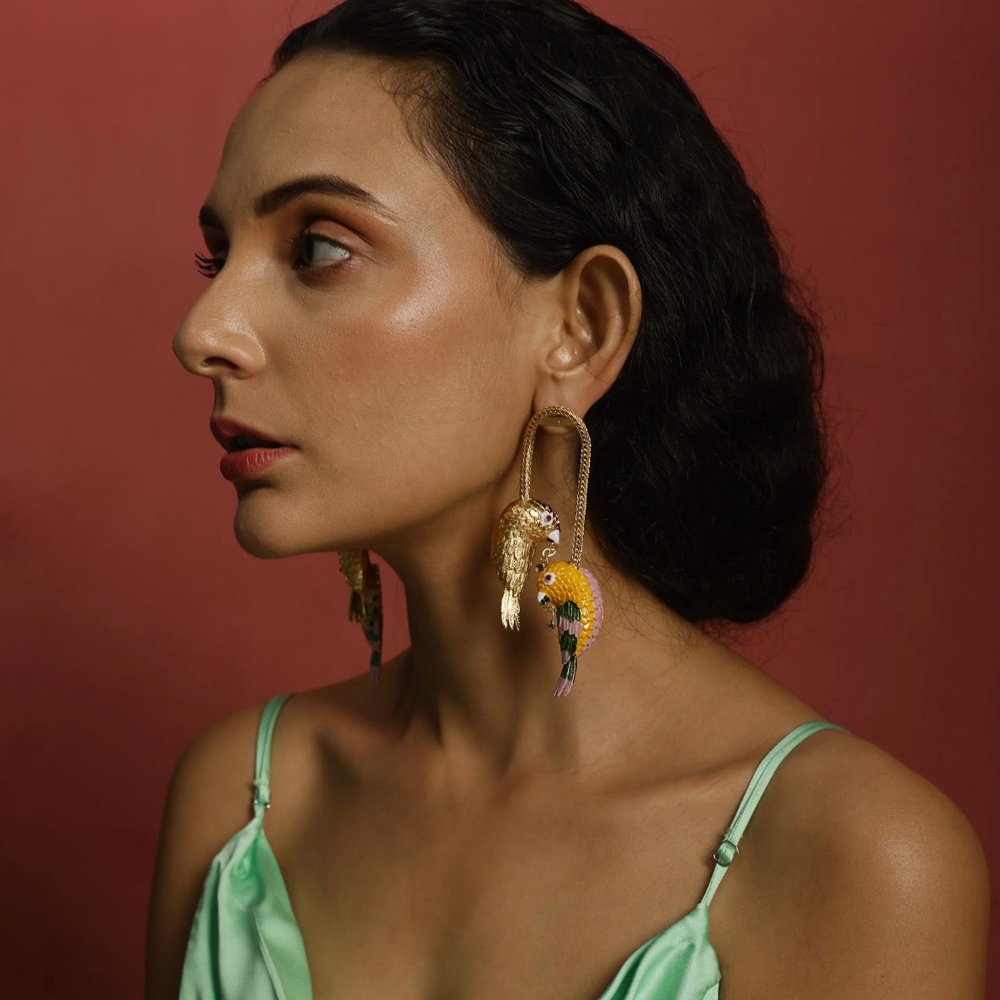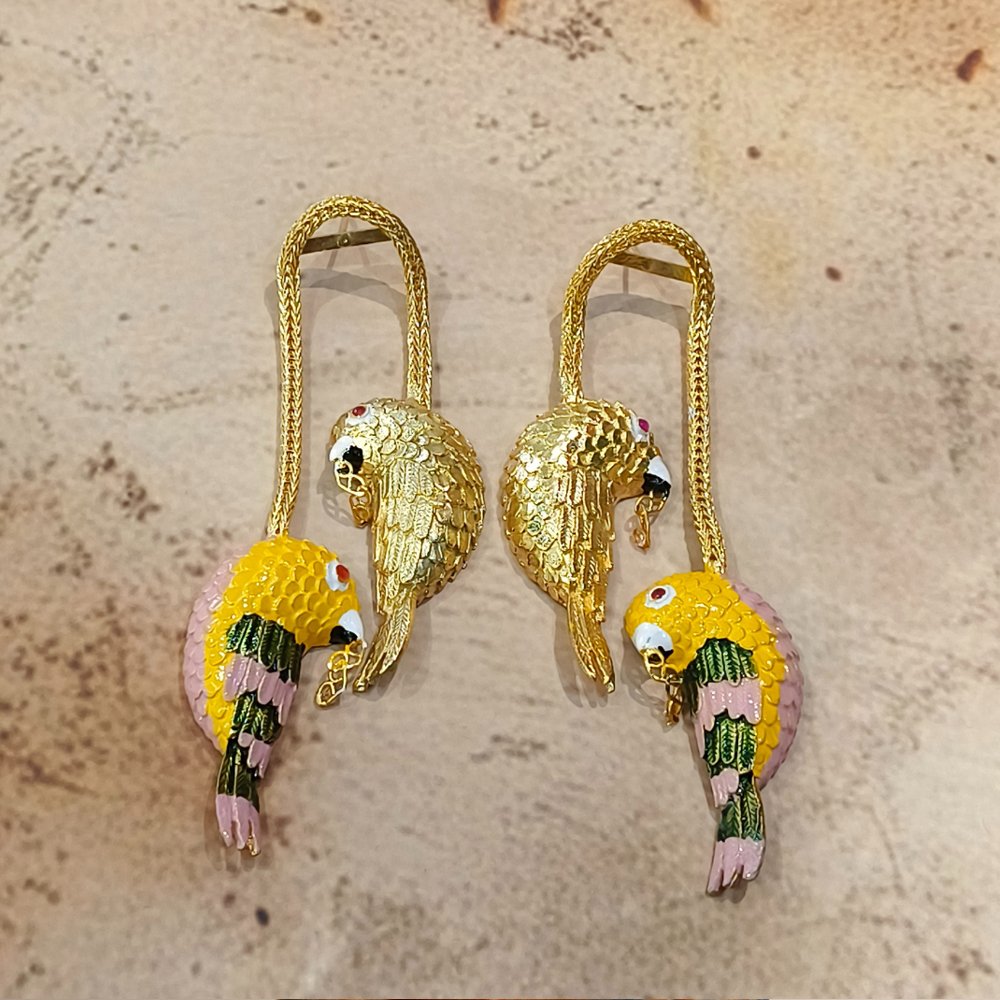 With a stunning contrast of the colours in these earrings make for a statement piece. The eye catching birds will make all heads turn your way! Set in brass metal with Gold and hand crafted enamel plating.