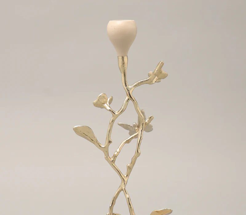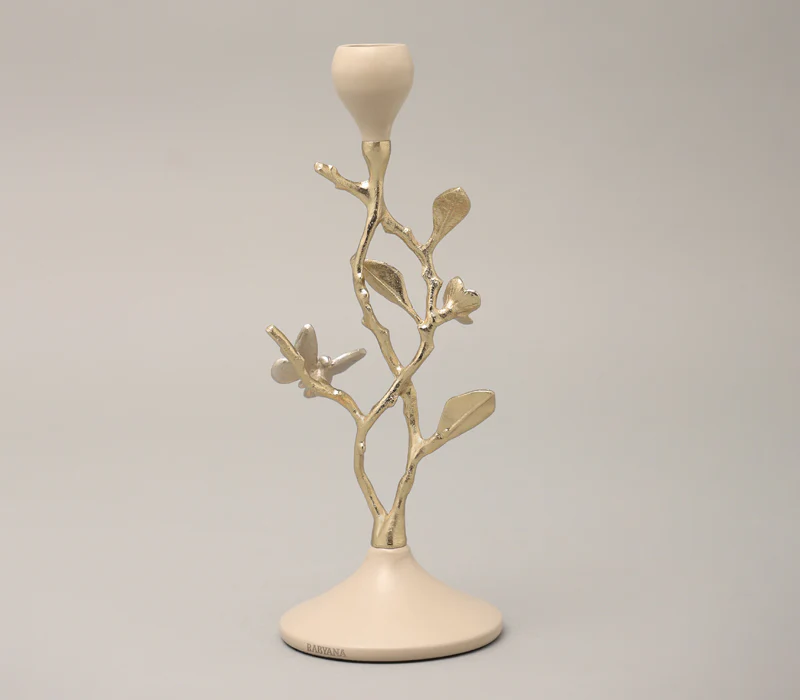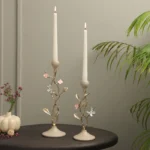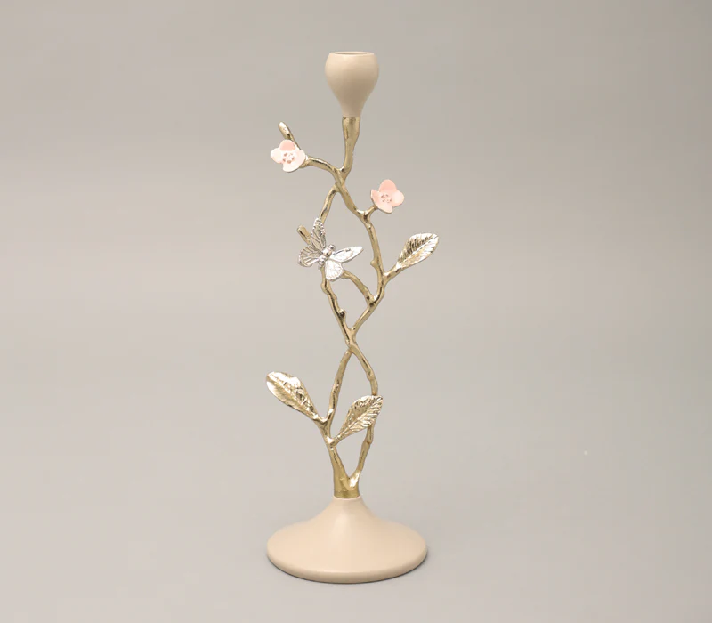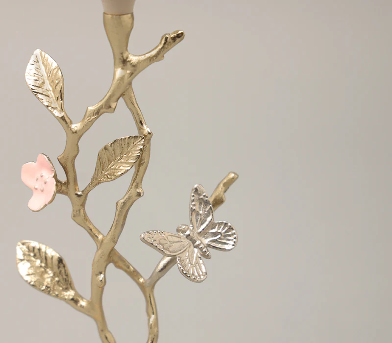 The summer solstice candle holders capture the essence of nature’s bloom and elegance, making them a charming addition to any space. This set of two delicate candle holders is crafted with a sand beige powder-coated virgin aluminum base, finished with gold and silver plating and enamelled brass flowers, giving it a soft yet luxurious feel. The base, shaped like a delicate tendril, is beautifully embellished with pink flowers, adding a touch of floral grace to the design. The summer solstice candle holders bring a whimsical and enchanting aura to your décor, celebrating the beauty of summer in every detail.