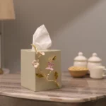 Adorning the top of the pastel virgin aluminum is a delicate pink butterfly perched gracefully among a few pink flowers on a gold brass branch. This intricate design adds a delightful touch of color and nature, making the tissue box not just a functional accessory but a stunning piece of decor.