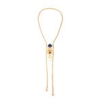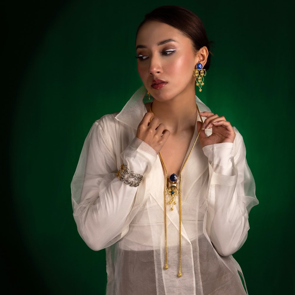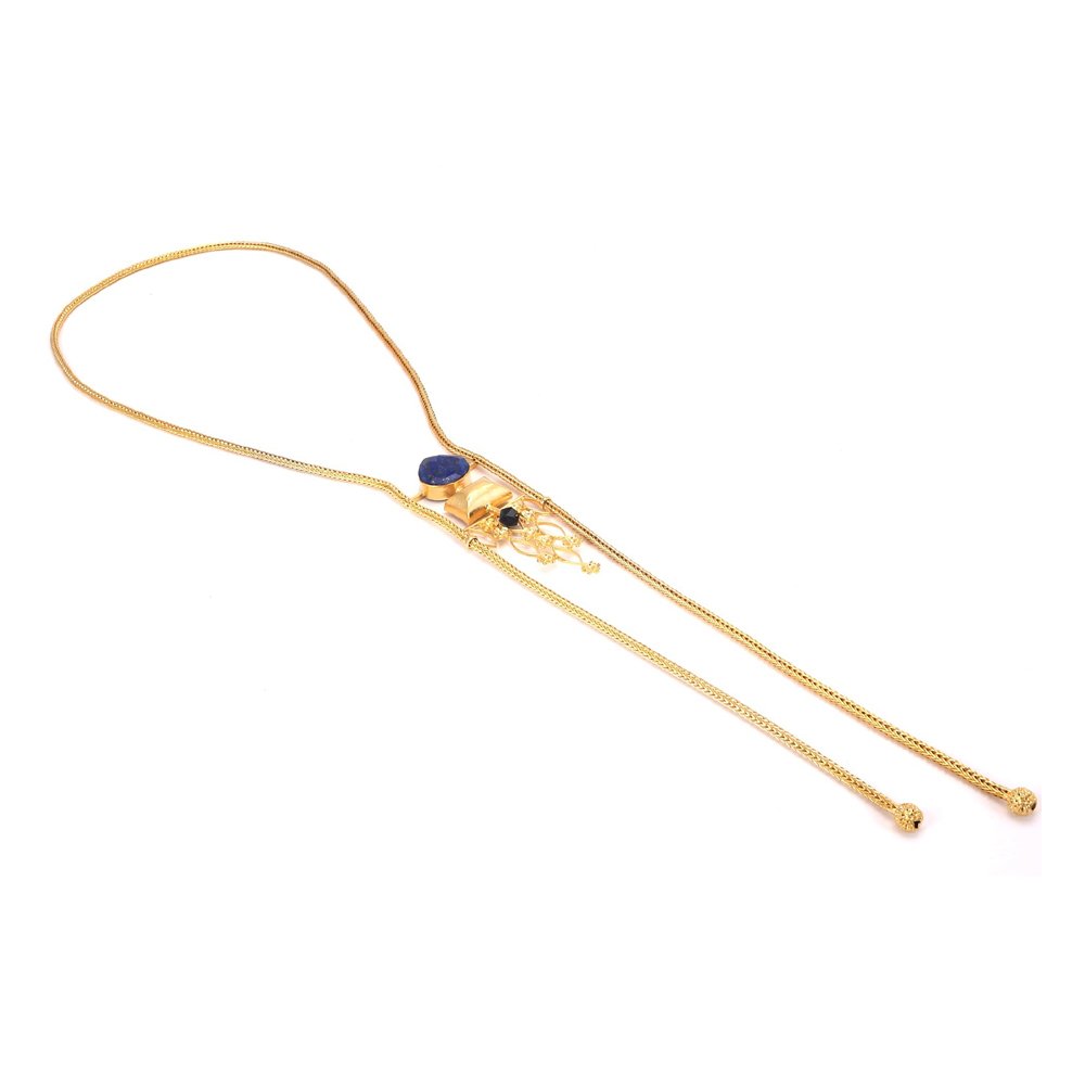 Taking experimental to fun new heights, two chains meet with a glamorous twist. The intricacy in the pattern adds an alluring charm to the look and feel of this piece. Set in brass metal with Gold plating.